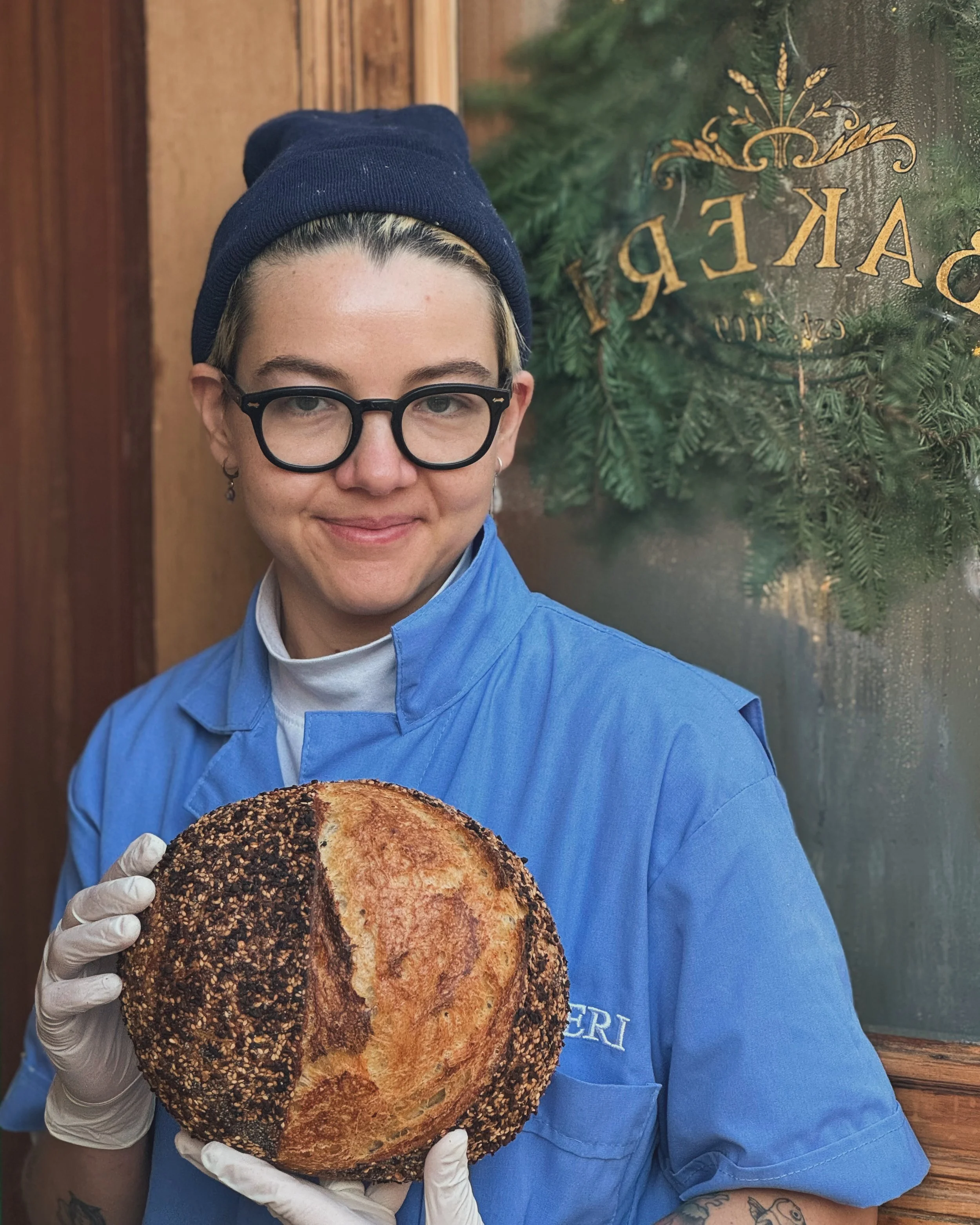 Our beloved bread baker and manager, Lucre, with our classic Sourdough Rye loaf with everything seasoning.